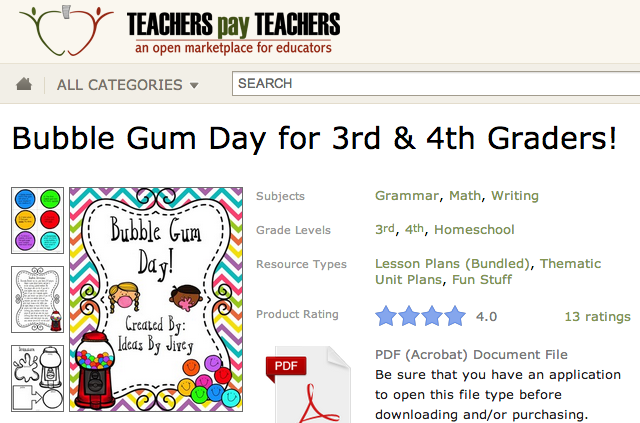 There are also lots of lesson plans and ideas for Bubble Gum Day online. This one is an entire day of Bubble Gum Day lesson plans for grammar, math, and writing.  It is very well done….I bought it tonight from TeachersPayTeachers.