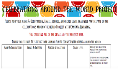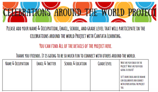 One more thing…..Please sign up on the Celebrations Around The World Project Google Document so we can get you all of the information and resources you need. This will also be helpful in sharing ideas and making global connections with others around the world.