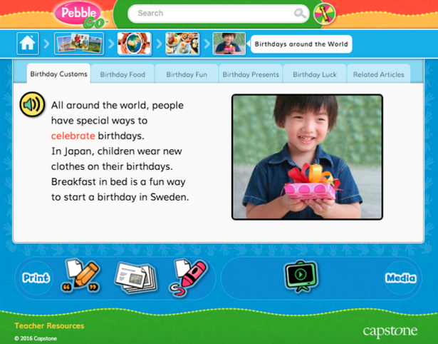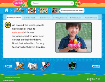 Within PebbleGO, there is a terrific section for Birthdays Around the World. They are going to make this available through a free trial, along with several eBooks in Capstone Interactive, to use as research and resources throughout the project.